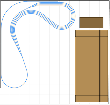This is a design made possible by CAD. It took several iterations to meet the design goals, learning along the way. A breakthrough came when the track marked in red was added to the plan. This stretch of track lets the train change directions on the bent-dogbone main line. That was half of the solution to long runs.