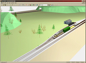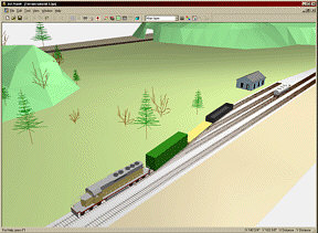 To couple, drive one piece of rolling stock into another just like you would on the layout. Youll hear a distinct sound to confirm to coupling (you can turn sounds off in View / Preferences / Sounds). At that point, the cars to which you have coupled become part of the consist and you can drive away with them in train. To uncouple, point your cursor to the junction of the two cars you want to uncouple, or to either car near the desired end, and click the left mouse button. Youll hear an uncoupling sound, and, if youre moving, the cars you cut from the consist will be left in position on the track. If you are stopped, you can drive away after uncoupling, leaving the cars behind. This sequence demonstrates dropping off a car at an industrial spur, then continuing on.